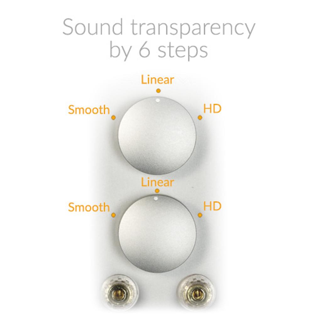 Auf der Rückseite befinden sich 2, jeweils zweistufige solide Schalter mit denen sich der Frequenzgang im Mittel- und Hoch-Tonbereich an persönliche Hörgewohnheiten oder die Raumakustik anpassen lässt.