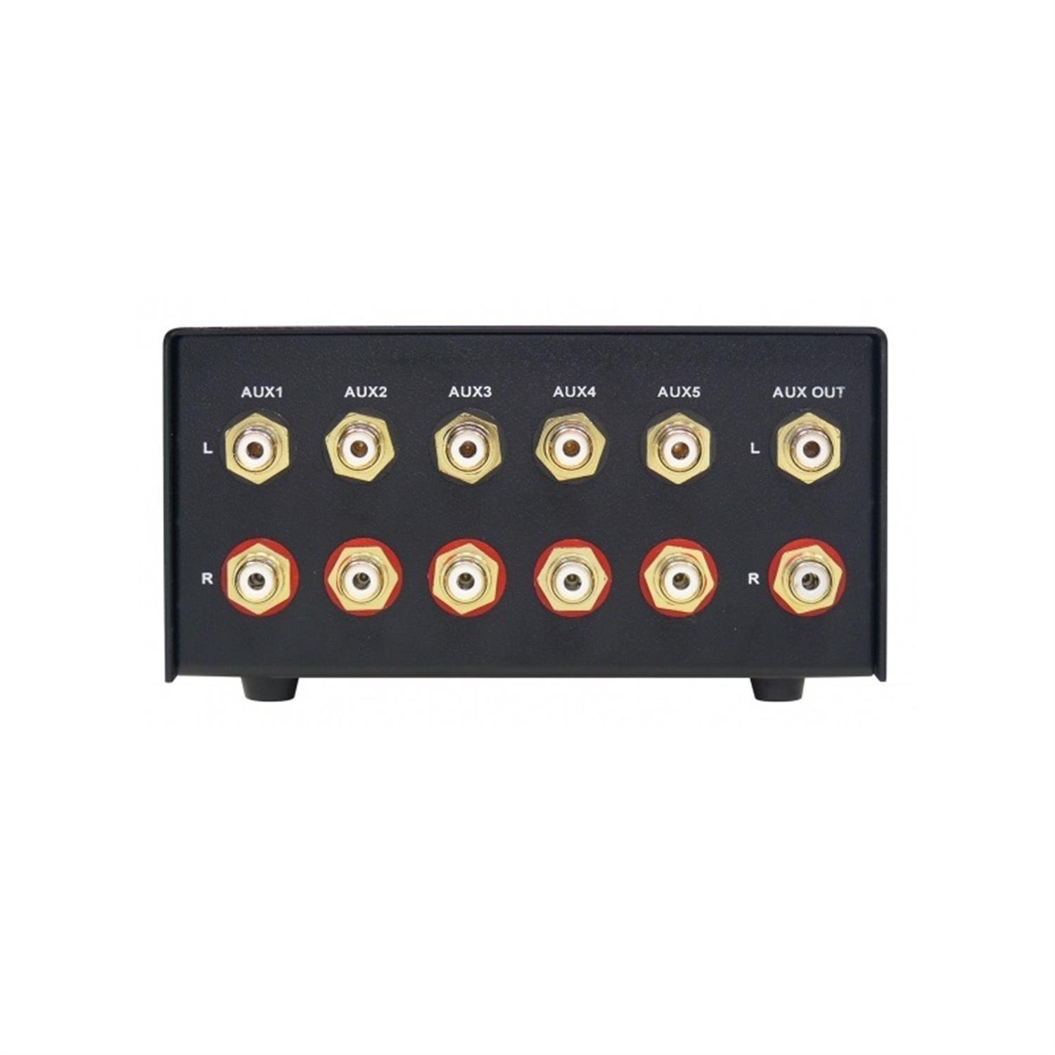 Audio-Umschalter mit 5 Cinch-Eingangsbuchsen.