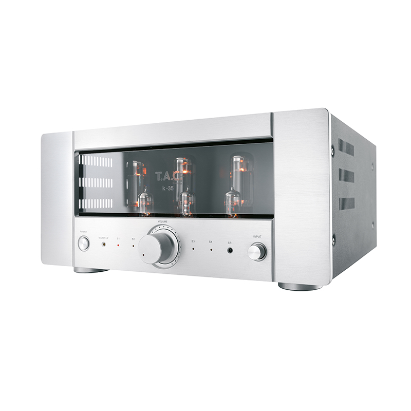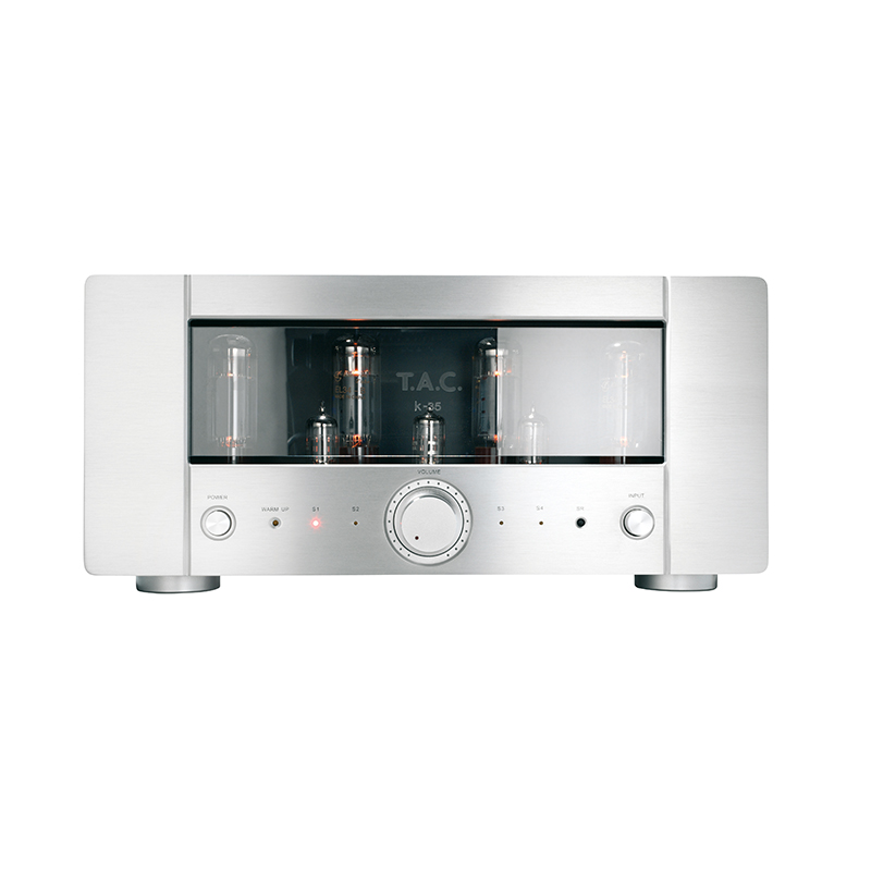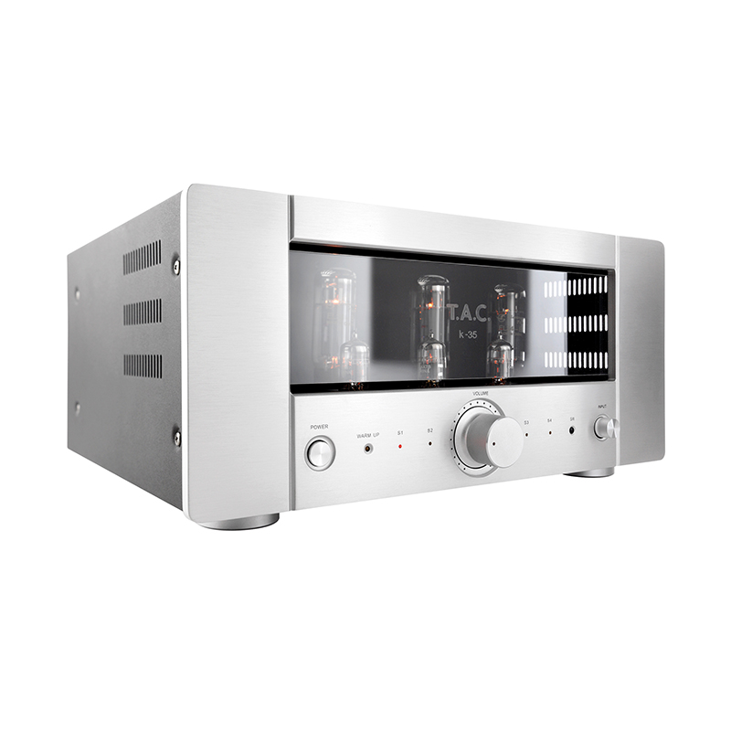 Die Weiterentwicklung der TAC-Geräte manifestiert sich nicht zuletzt in der Formensprache der neuen Geräte. So zeigt das Design des K-35 klar, dass hier ein großer Schritt gemacht wurde. Wie im großen Bruder V-60 arbeitet auch hier eine automatische Bias-Kon troll einheit. Die Röhren arbeiten somit immer im optimalen Arbeitsbereich, Änderungen durch Erwärmung oder Alterung der Röhren haben keinen Einfluß mehr. Ein optimales Zusammenarbeiten der Vorstufen-Röhren (1x 12AX7, 2x 12AU7) mit den End-Röhren (EL34x4) ist so stets gewährleistet. Die Lautstärke wird mittels Alps Poti und Fernbedienung geregelt.