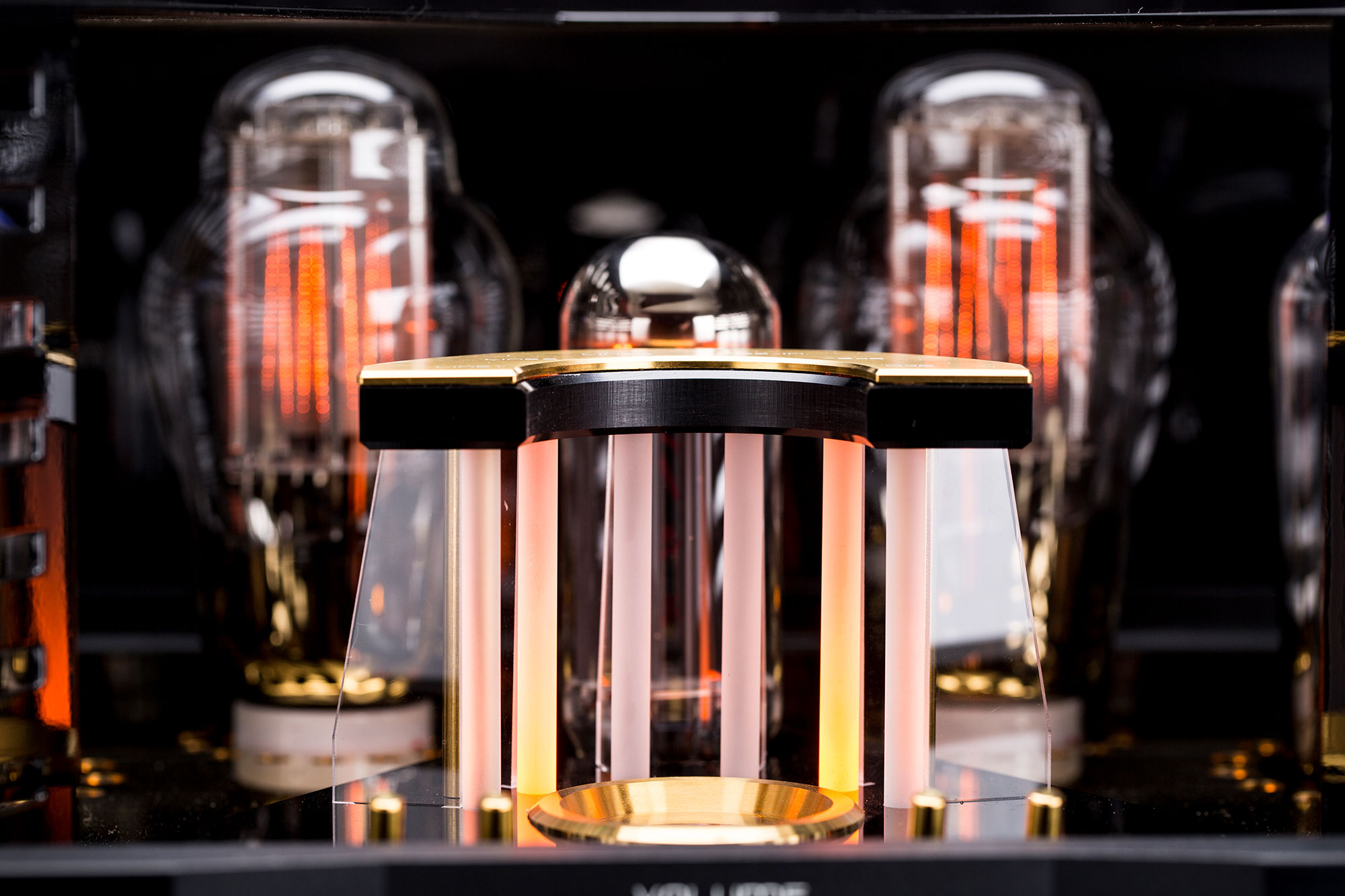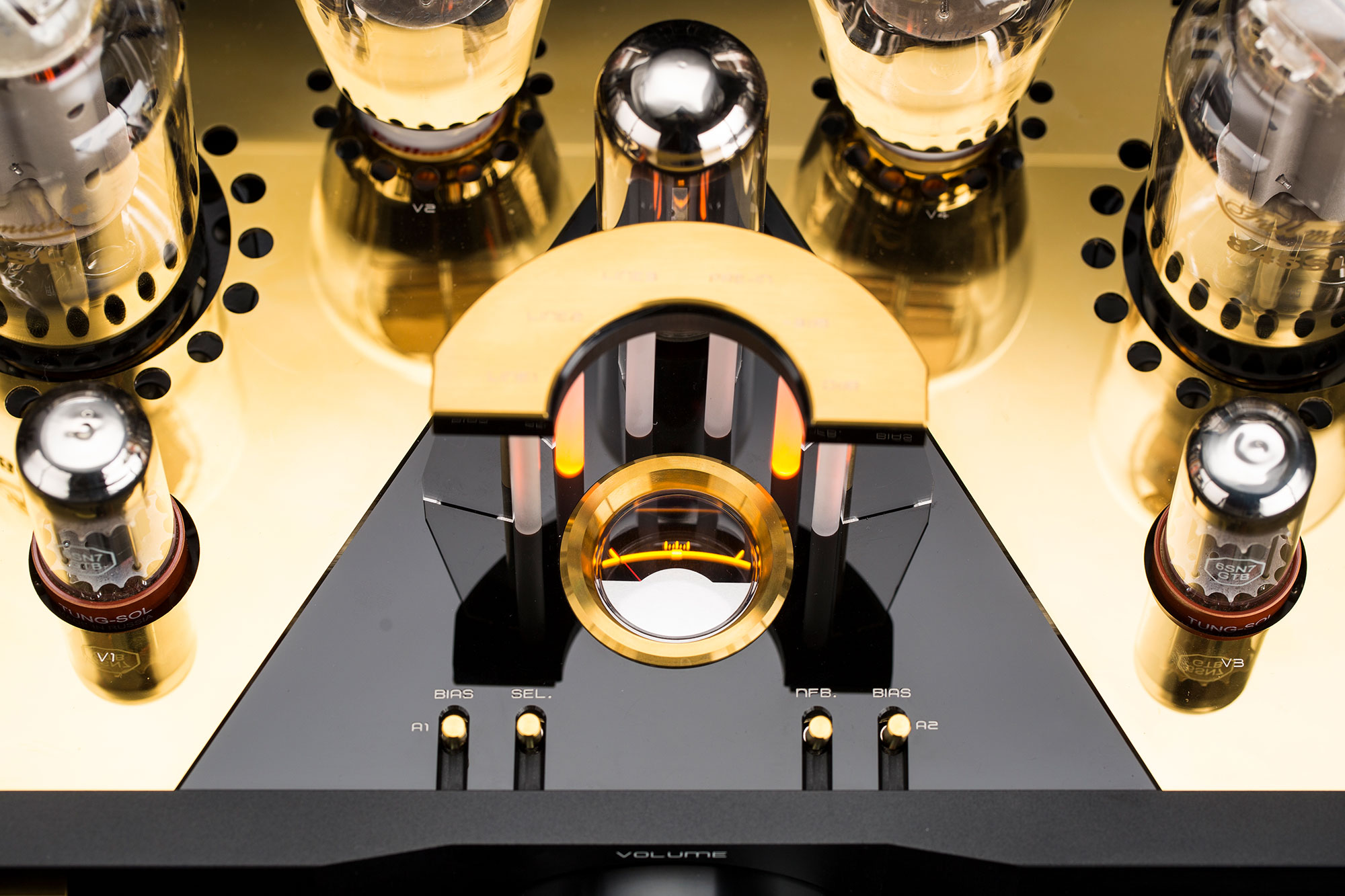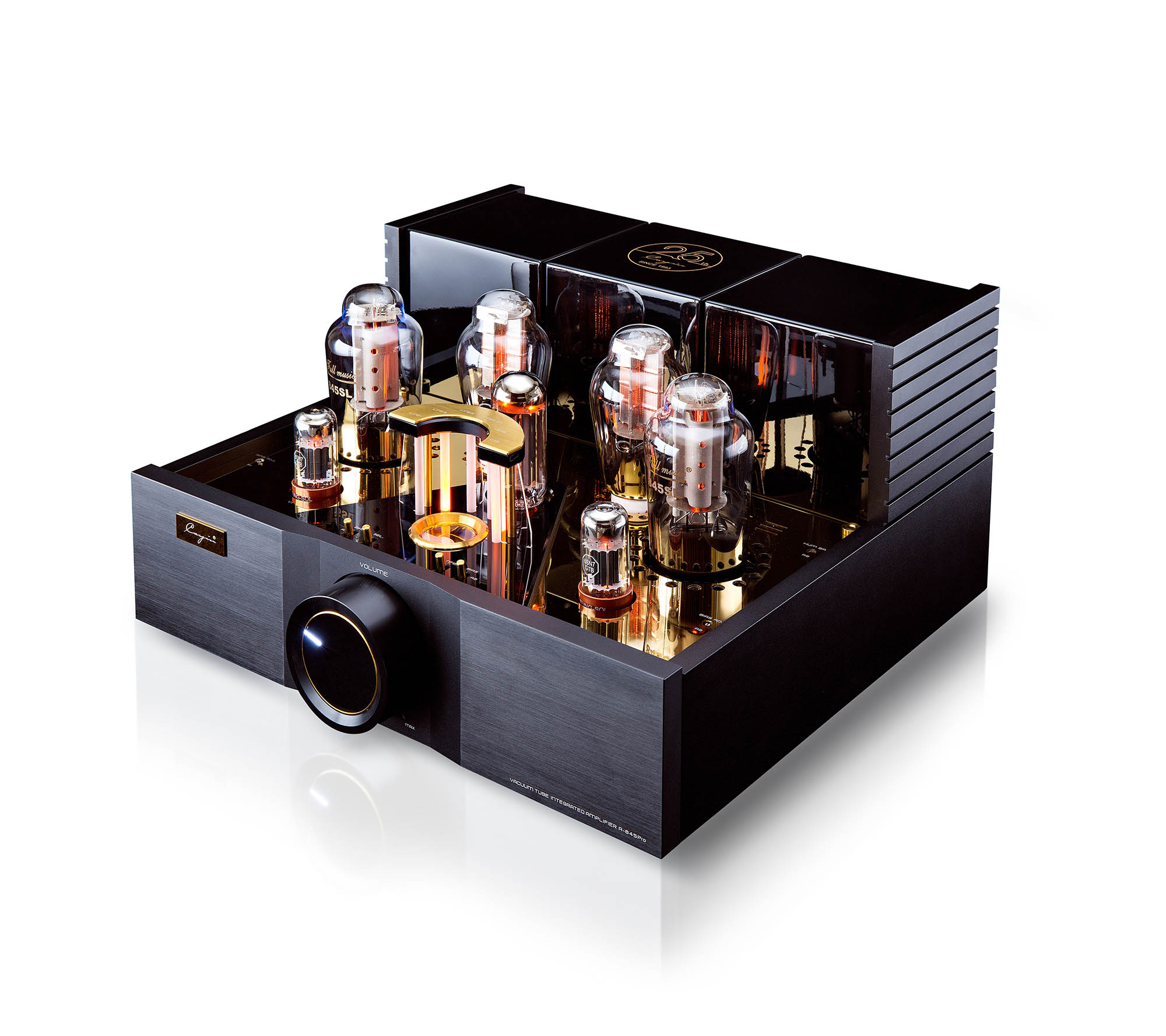 Zwei Full Music 300B/n in Porzellansockeln übernehmen die Arbeit in der Treiberstufe für die beiden graphitbeschichteten Full Music 845SL. In der 300B/n kommt ein patentiertes feinmaschiges Anoden-Gitter zum Einsatz. Die Single-Ended-Class-A-Ausgangstufe mit ihrer Full Music 845 produziert 25 Watt pro Kanal. Ein neues Schaltungskonzept spart gegenüber konventionellen Schaltungen 82 % Energie und reduziert die Temperatur der Ausgangsröhren signifikant.