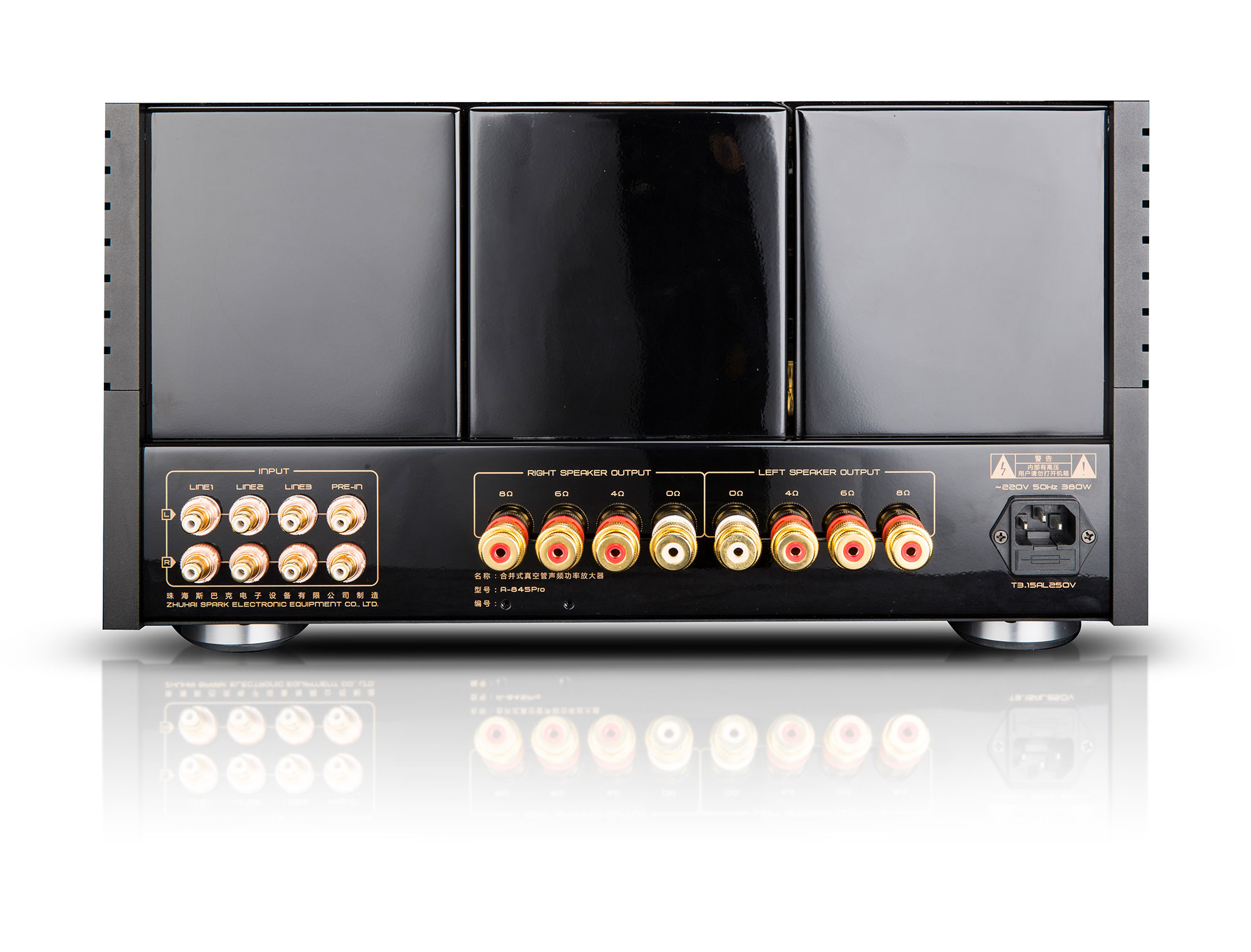 Unter den vergoldeten Anschlüssen findet sich ein Vorverstärkereingang, der den Einsatz als Endstufe ermöglicht. Als Partner bietet sich dabei für den Cayin A-845 Pro der Cayin SC-6 S MK2 an. Weitere Besonderheiten sind die von außen regelbare Hum Balance und Bias-Regelung mit Anzeige-Instrument. Außerdem lassen sich von außen die Rate der Gegenkopplung an die verwendeten Lautsprecher und den eigenen Geschmack anpassen. Selbst die Verdrahtung des handgefertigten Cayin A-845 Pro entspricht höchsten Ansprüchen mit ihrer Teflonummantelung und den silberbeschichteten Litzen.