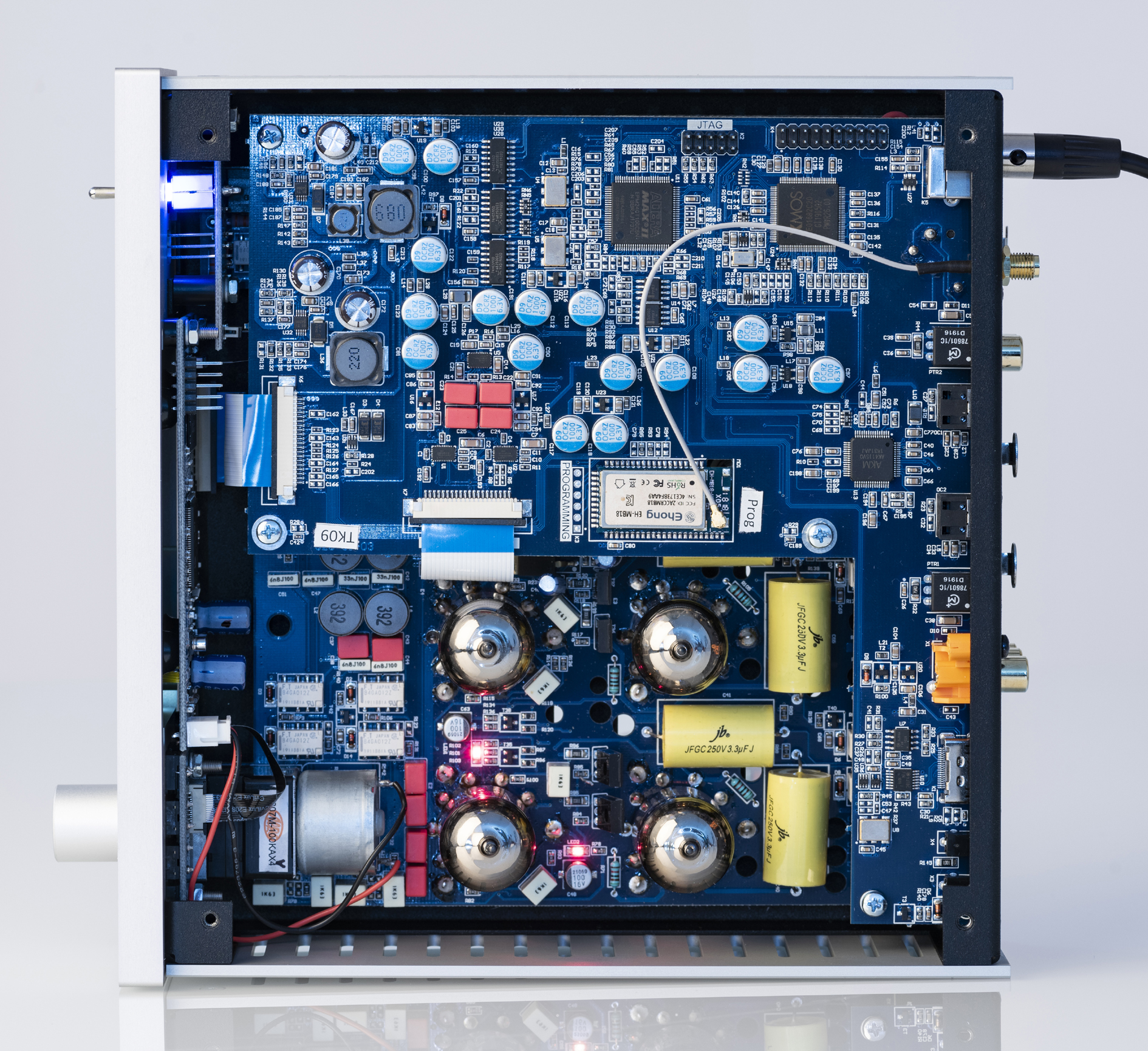- Fernbedienbarer Vorverstärker mit D/A-Wandler und Upsampler.