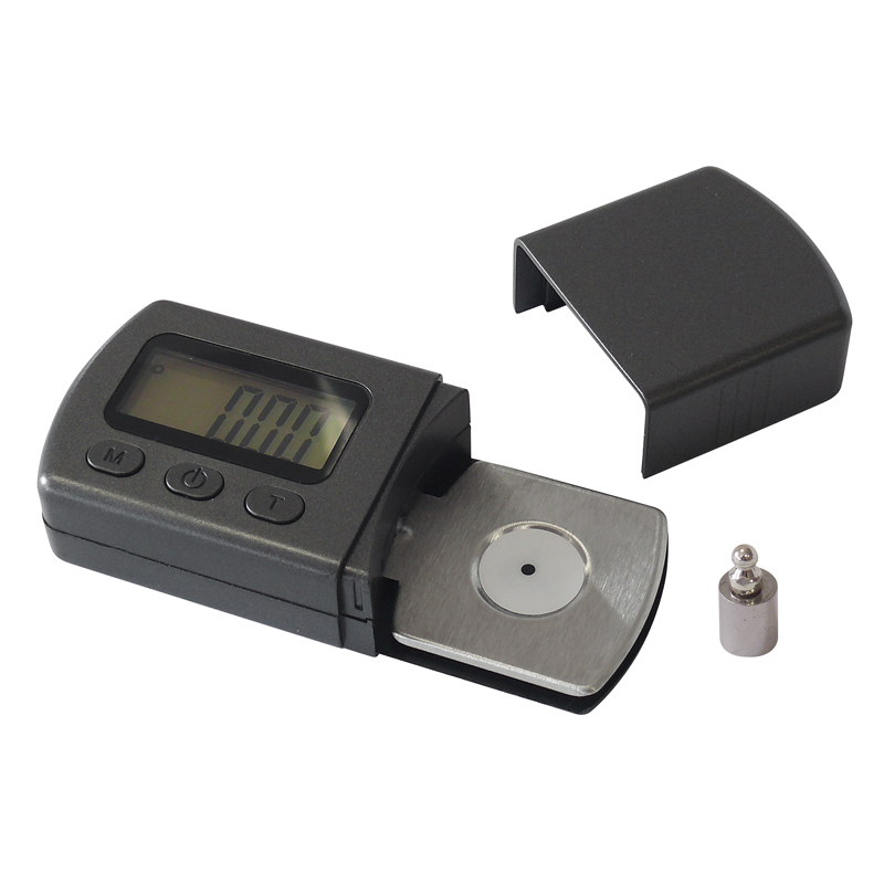 Elektronische Tonarmwaage im schwarzen Kunststoffgehäuse. Ermitteln Sie präzise die Auflagekraft Ihres Plattenspieler Tonabnehmer-Systems. Messbereich: 0 - 5 g, Messgenauigkeit: +/- 0,01g. Mit im Lieferumfang befindet sich ein Kalibriergewicht 5g, 2 x Knopfzelle (AG12) für den Betrieb, sowie eine Aufbewahrungstasche. Maße: ca. 95 x 42 x 20 mm. Gewicht: ca. 50g